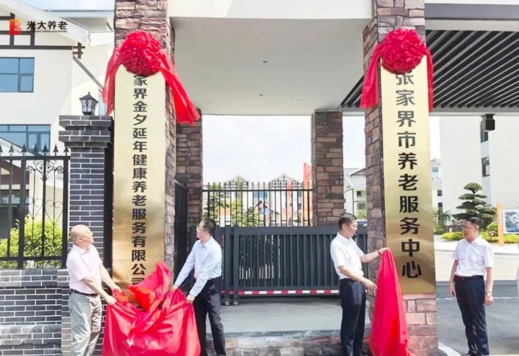 张家界市人民政府副秘书长杨兴平,张家界市民政局党组书记、局长郭铁军,中国光大养老健康产业发展有限公司党委委员、副总裁张敬文,无锡光大金夕延年养老运营管理有限公司执行总经理张建华共同为光大养老·庸园康养基地(张家界市养老服务中心)揭牌。